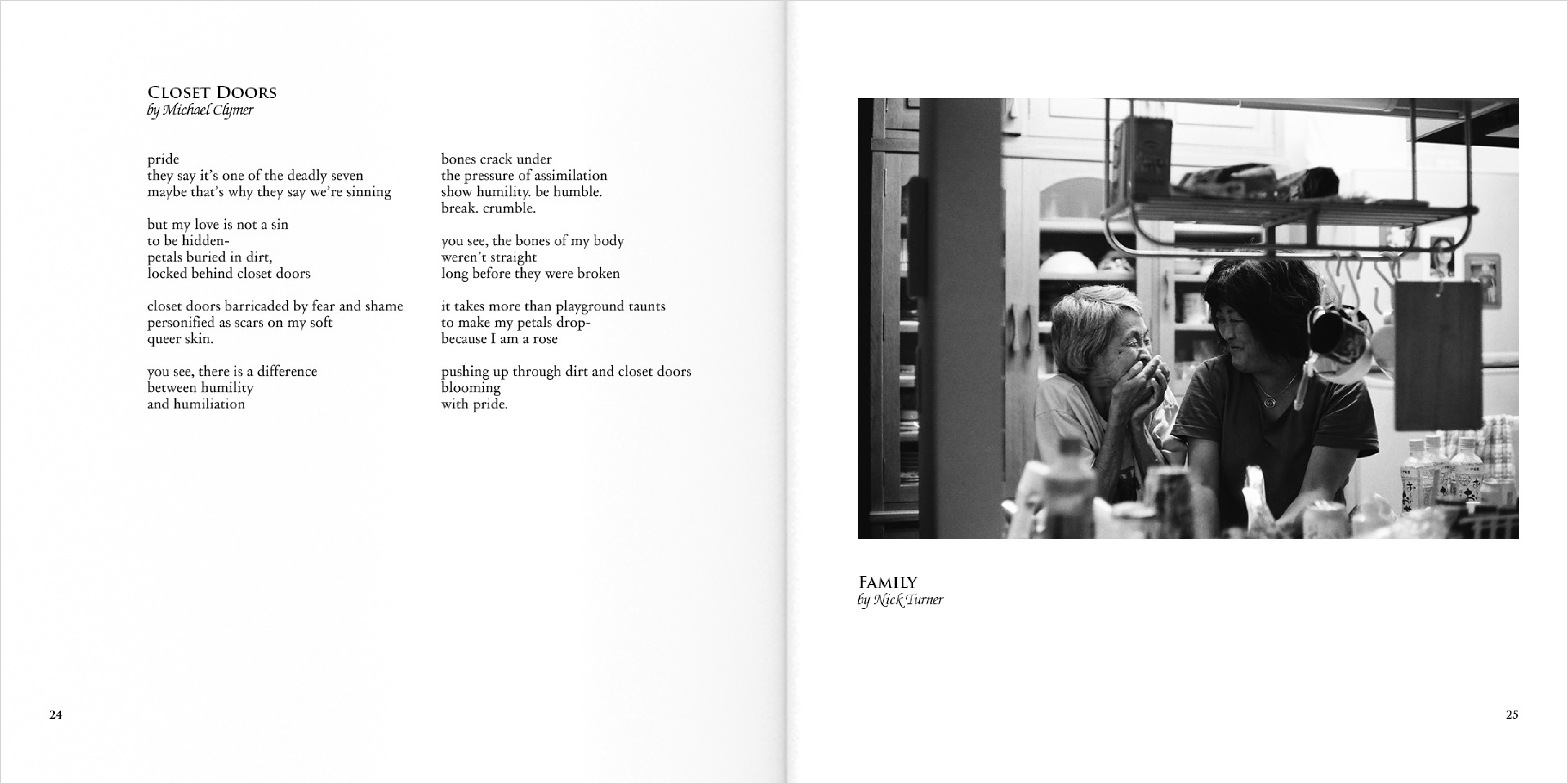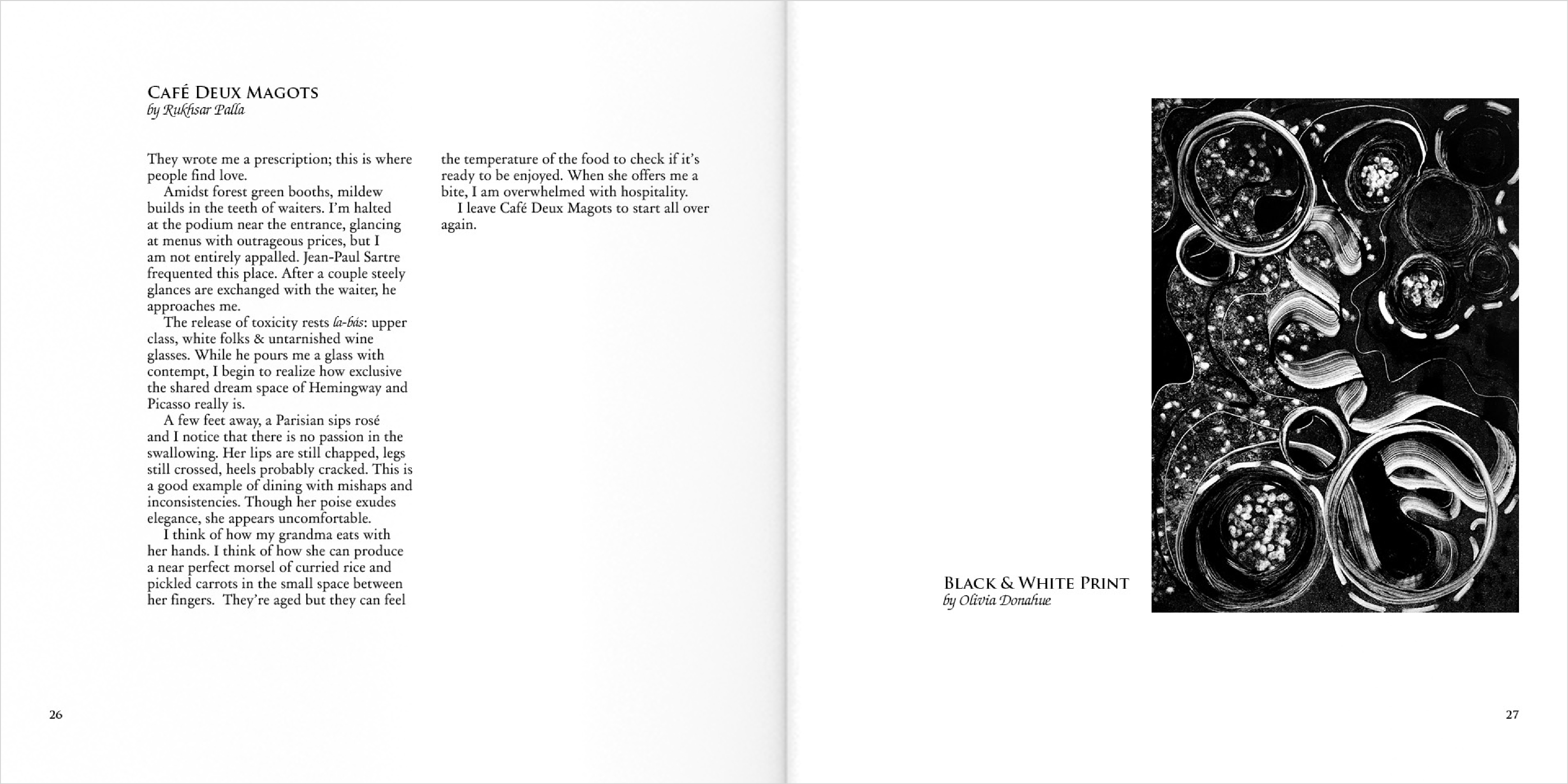I collaborated with a team of student editors, contributors, and designers, to produce the 58th edition of Fragments following the theme of “Humility”. I contributed to typeface selection and generated layouts, and as a team we selected and sequenced all of the submitted literature and visual art pieces. We chose to use serif typefaces and hand done calligraphy for the cover to provide a warm tone and human touch.
